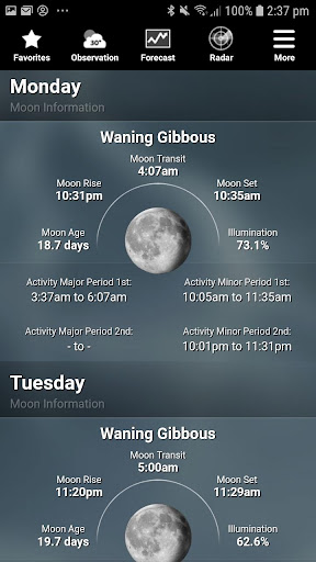 - Exclusive celestial information from sunrise, sunset, moonrise, moonset to major and minor periods information used by fishermen and hunters.