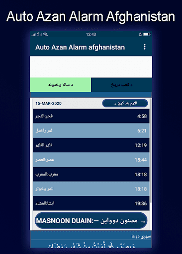 Muslim Apps 360 Presents Auto Azan Alarm Afghanistan which gives you accurate prayer times & Notification before Sahri and Iftar. The Prayer times algorithm supports a large Prayer calculation methods adopted by many Muslim countries. If you want you can change the prayer method manually in the Settings tab.