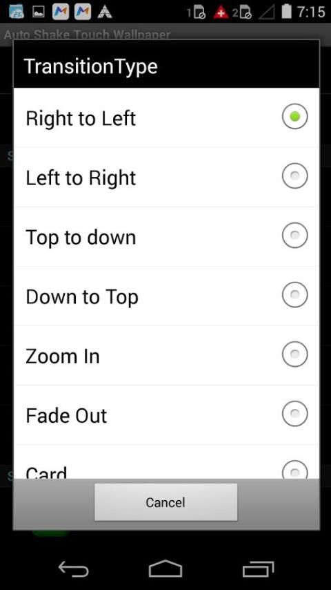 Are you feeling bore with single and non animated wallpapers, then definitely this is the best suitable for you. This "Auto/Shake/Touch HD wallpapers" is very useful for you to change wallpaper in 3 different styles and various transition effects as given below.