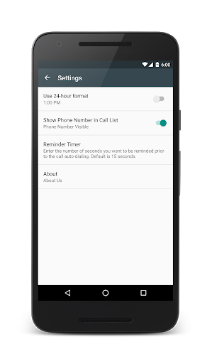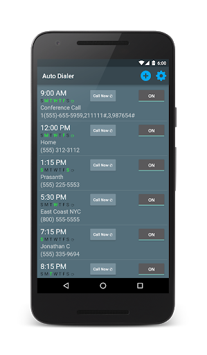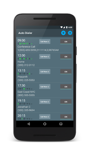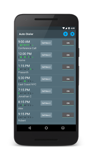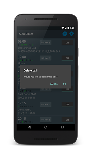 AutoDialer allows you to set automatic outgoing calls on a specified time and day of the week. It also allows you to auto-dial into your corporate conference calls/meetings. The app gives you a lets you customize a specified second warning and gives you the option to cancel the call or dial now. After the specified seconds, the app auto-dials the call you scheduled. You can turn on and off the call. Lastly, this app can be used as a one-tap dialer, using the call now button. It is useful for dialing into your conferences or meetings in one click! To delete a call hold the call until a dialog asking if you want to delete the call comes up. To edit, simply tap on the call you want to edit. Disclaimer: This app cannot be used to make 911 calls.