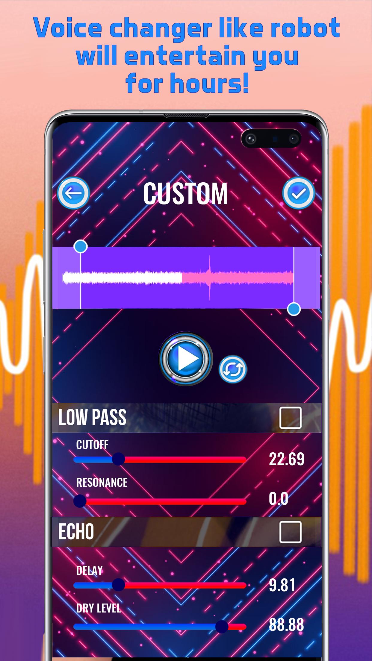 ! Make high pitched noises, use voice changer celebrities to sound like a famous singer! Edit voice recording editor to modify voices with the coolest vocal filter! Try out one of the best sound apps with voice effects for singing and you will not regret it! Tap to record your voice, modify it with cool sound effects to get an auto tune voice effect! Edit your voice with a robot voice generator in the latest audio mixer studio! Have fun using this amazing voice modifier for singing which is also an audio editor that you can use to create cool phone ringtones! Try it out today for free!