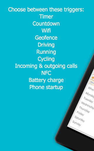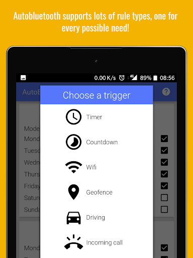 Timer: User specifies a time interval and specifies the days in the week where the rule shall turn BT on.