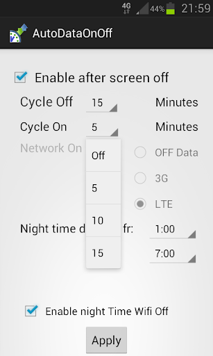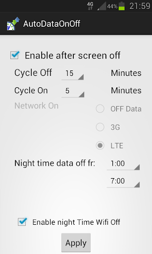 The app is activated per 5 minutes to check the screen off. If the screen is off, it turns off the mobile data network and refer the setting Cycle Off & Cycle On to control the data network on & off continuously in the background. If the current time reach the period in Night Time Setting, it will not turn on the data network and also turn off the Wi-Fi. For screen on, it keeps on the mobile data network even in night time. If Wi-Fi is connected, the mobile data will not on and take Wi-Fi as data path.