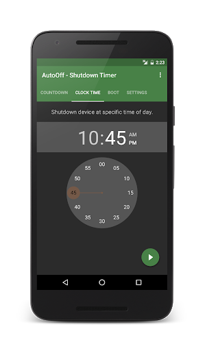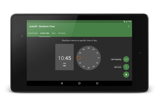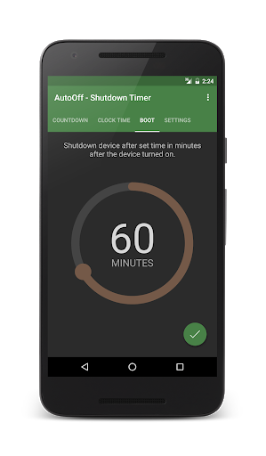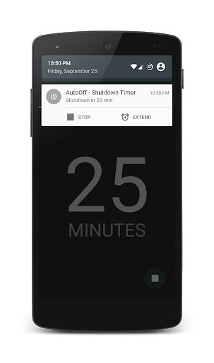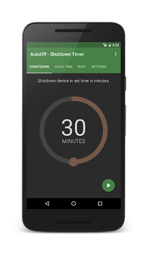 AutoOff allows you to automatically shutdown your device at a set time. You can schedule the timer either in minutes until shutdown or set the exact time of shutdown. Furthermore you can set the timer to automatically start on boot.