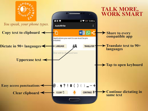 AutoWrite is a speech-to-text app. Integrated with Google voice, your words are smartly typed as you speak and can be shared on any app with just one click!