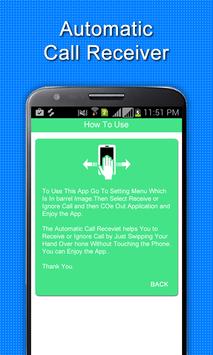 Automatic Call Receiver is helpful for receiving and reject the call ,without touching the android device.user can easily receive the call by simply swap the hand over the smartphone.The device Automatic gesture detect the required information for pick or dropped the call.
