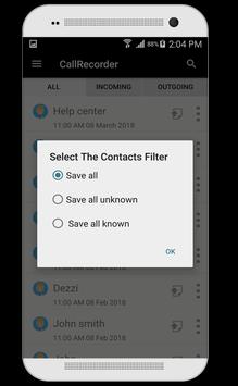 You can apply call filters on all your incoming and outgoing calls. You apply filter to save all calls, all known calls and all unknown calls.