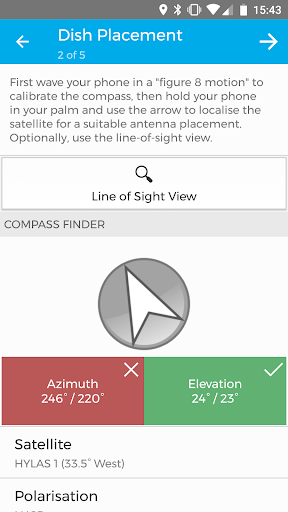 • Dish placement – using built in GPS, compass and accelerometer / gyroscope to calculate and display the location of the satellite on-screen, using either a compass view or “Augmented Reality”.