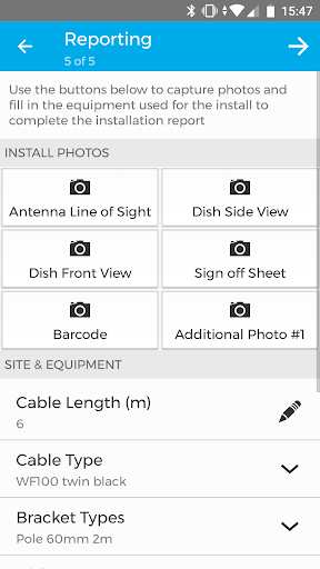 • Reporting – report details of the install directly from the phone by taking photos of the site with the built in camera and use the barcode scanner to store equipment serial numbers. All reports are uploaded to the OSS via the commissioned internet connection.
