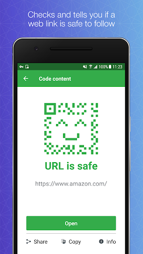 Stops infected sites from loading and reveals the full URL linked to a QR code.