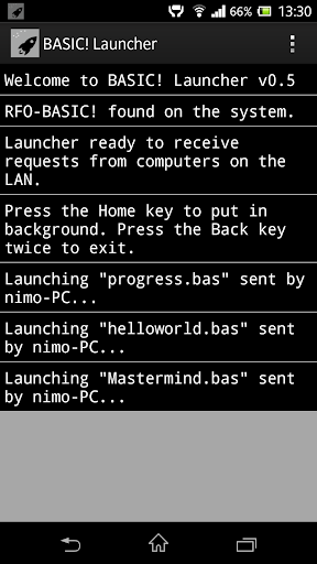 NB1: the transfer of the file can also be done by cable with the Android device plugged to your computer (USB-debugging option needs to be activated). In this case you don't need the BASIC! WiFi Launcher of course, but you still need BASIC! and the BASIC! Launcher PC Package. See details at http://mougino.free.fr/basiclauncher.html