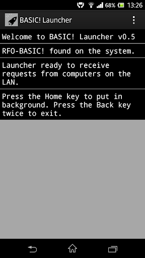 After download, run the BASIC! Launcher (WiFi) on your Android device and hit the Home key to send it to the background. The app will intercept transfers from your computer and launch the incoming program. No additional configuration needed; as long as computer and phone are on the same LAN they autodetect each other.