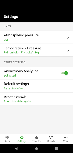 ▸ Settings: Under this menu all important parameters for the determination of the atmospheric pressure as well as for temperature and pressure values can be adjusted. Other functions allow for a change to default settings and a repeated display of the “Tutorials” in the ruler view.
