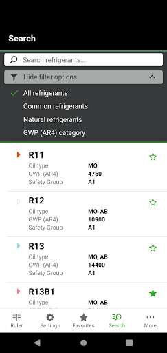 ▸ The app contains data and information on more than 100 natural and synthetic refrigerants, which can also be preselected by filter functions (under "Search").