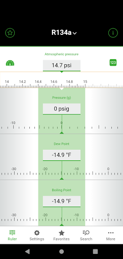 ▸ Ruler: By means of a slider, the values of pressure, dew and boiling (bubble) temperatures (temperature glide resulting from the difference) for the selected refrigerant can be determined. Pressure and temperature values can also be entered manually - either by tapping on the respective field or via the symbol "123". When installing the app overpressure values are preset. With this setting, the atmospheric pressure can be entered either manually on the upper ruler or via the "barometer symbol" to correct the pressure values. A change to absolute pressure values is possible under "Settings", the atmospheric pressure correction is then inactive. Further function: By tapping on the refrigerant name, direct access to "Search" (refrigerant list and search filters) is also possible.