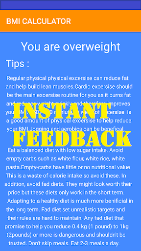 This app calculates your Body Mass Index and provides your BMI number. It will also :