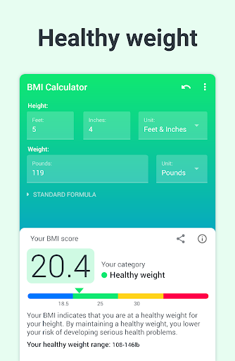 Discover easy to use and free BMI Calculator App and Weight Tracker. The Body Mass Index (BMI) is calculated with the standard formula used by WHO (World Health Organization).