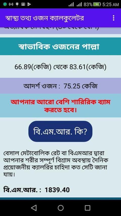 This is your BMI (BMI) and biemaara (BMR) to evaluate and body weight control and health services in an app store, which is very easy to use. The report from the application of personal health information. App gender, age, weight and height gives health advice. The app made recovery plan, fat reduction, susasthya protection, health education, food and energy is very useful to analyze.
