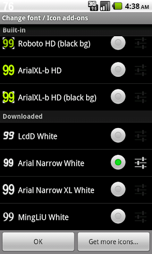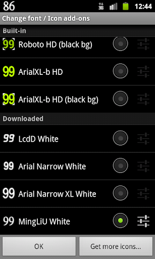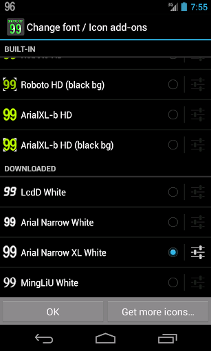 For Android 3.x/4.x users who wish to have the brightest colors possible on their dim status bars, look for our HD add-ons with “b” after the font name. Download HD add-ons within Battery Notifier Pro BT or search for "bnbt" in your browser at Google Play.