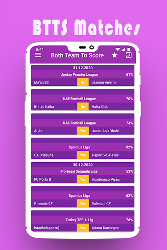 BTTS both team to score goal rush or goals galore. Very simple bets tipsters where only need both teams in a football match to score at least one goal for the betting tips to win. This bet can come in at any time from the last minutes until from the first 5 minutes you have always got a chance. In our app you can find the both teams to score tips for over 100 leagues and the top 10 leagues with the important games where both teams score. Also included are both teams to score 1st half, 2nd half htft(ht/ft fixed matches), Football betting tips,football betting odds, tipsters predictions and livescores and Over 2.5 goals.