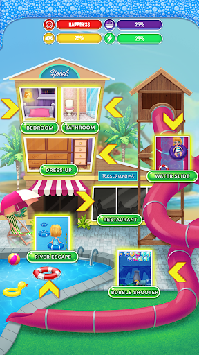 Join this amazing experience where you will be assigned to take care of Bella's needs where is in terms of feeding, having a good general statement, having a fashion outfit or anything else that will make possible the best holiday for this cute little girl. This game provides more games in one and will make you feel a responsible person by taking care of all requirements. The desired destination is Tenerife and we all heard that there are a lot of cool things to do around there. Prepare Bella for a great day and make sure you fulfill her needs like having a full stomach so her body could procure the necessary energy. You could buy new food items from the shop with the money you've earned in the playroom. A girl needs her best outfit to be able to go into the world, so check the store and equip her with crazy accessories and why not with a whole new look. Check the shoe item and choose the ones you like then get a suitable swimsuit for her so she could rock her look with a pair of sunglasses. Select a hairstyle that will combine perfectly with the final aspect. You've got these wonderful mini-games where you could gain money if you succeed to accomplish whatever the games ask. The bigger the score the greater the money, so try all of the games. The water slide from the resort is a lovely trip in a tub on top of the lifebuoy. Next, you've got the navigation on the lifebuoy where you have to keep Bella safe and protected from the other lifebuoys. There is a crazy game where you need to fit same bubbles of fish so they will burst together bringing you more money. After all this playing our girl needs to rest before she can conquer more territories in the water world. A quick nap is the best idea now and after you give her a shower, she will be able to get a good and revitalizing sleep. Look after her needs and if you have to go to the feeding part again, or any other phase that will make her requirements bars go full. There are a lot of surprising features that await to be discovered in this baby game.