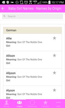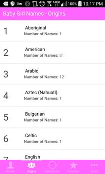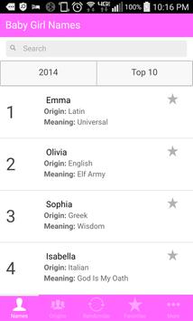 Browse through the most popular baby names over the last 6 years based on the U.S. census and save your favorites! Each name shows the meaning and origin. With an easy to use interface you can browse girl baby names, top names (10, 25, 50, 100, 250, or 500), and baby name origins.