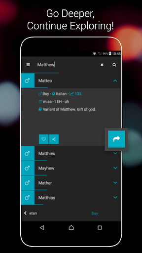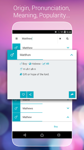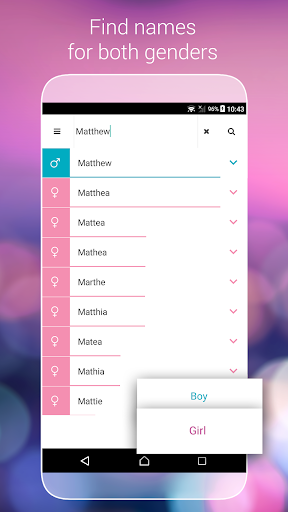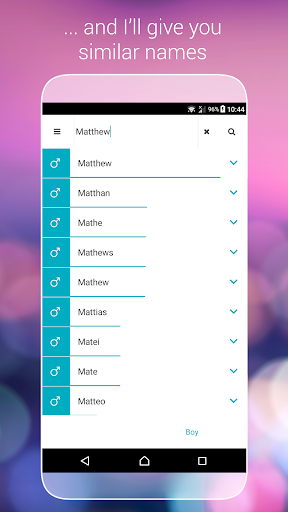 Find names based on similarities: This app uses a unique algorithm that can find names close to the ones you like. The algorithm takes everything into account: origin, meaning, pronunciation, popularity and more, so you can find the best name!