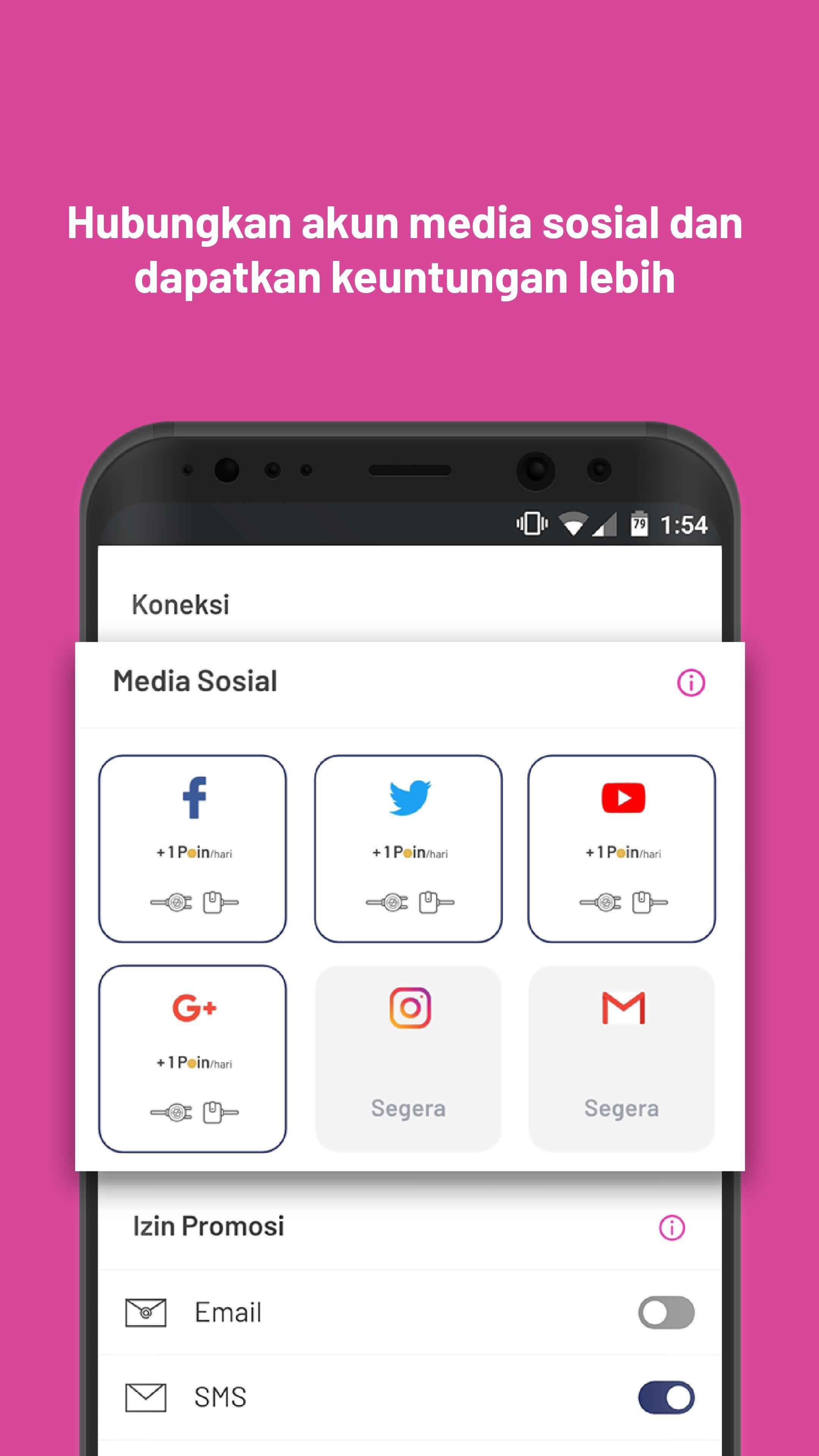 • Hubungkan Media Sosial : Hubungkan akun media sosial dan dapatkan keuntungan lebih dari data media sosialmu