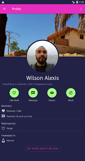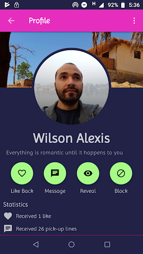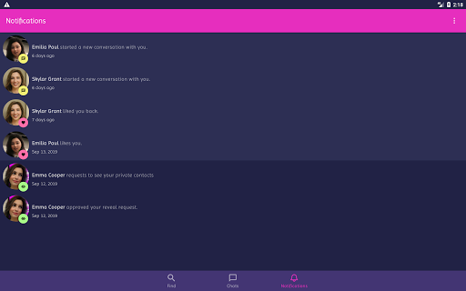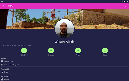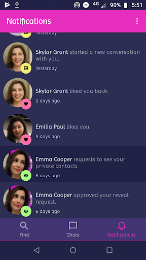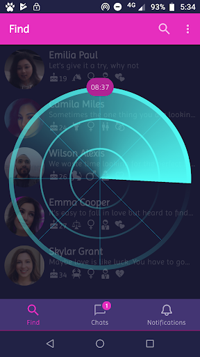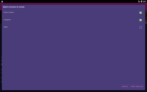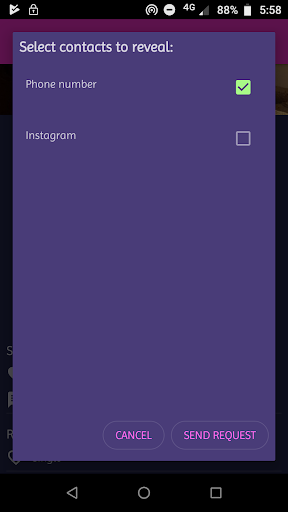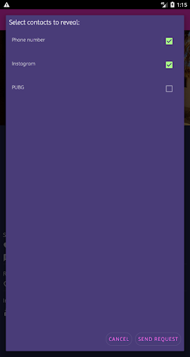 - Once you find someone, you can start chatting immediately, send a like, see his/her social profiles if they are public, or send a reveal request if they are private.