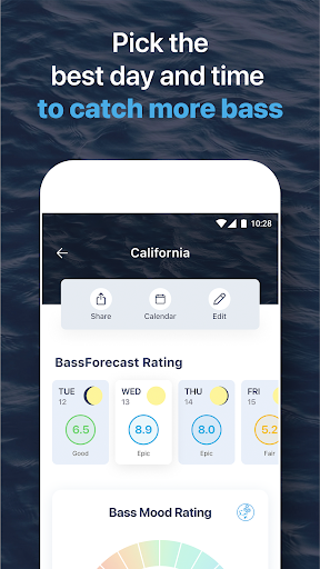 • 10 Days in advance BassForecast Ratings so you can pick the best days (and times) to Bass fish