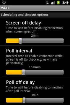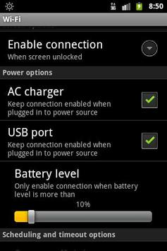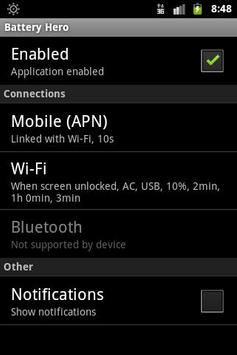 Controls selected connections to save battery life. Connections are disabled when screen goes off and enabled back according to your settings. There are several options provided to customize connection control.