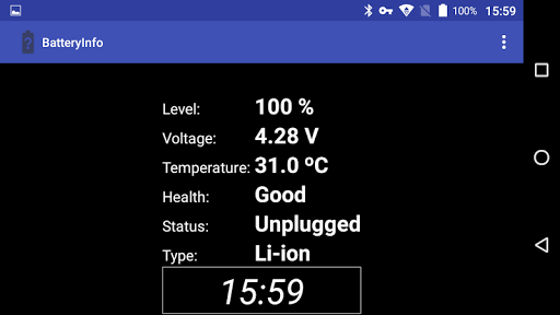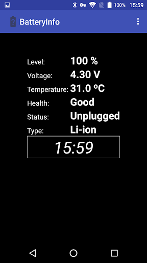 Displays: Battery Level, Voltage, Temperature, Battery Health and Battery Type. Useful for monitoring your battery.