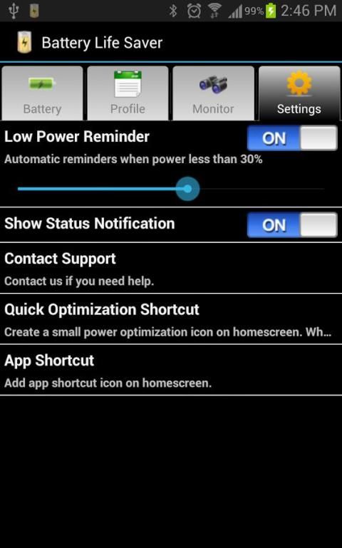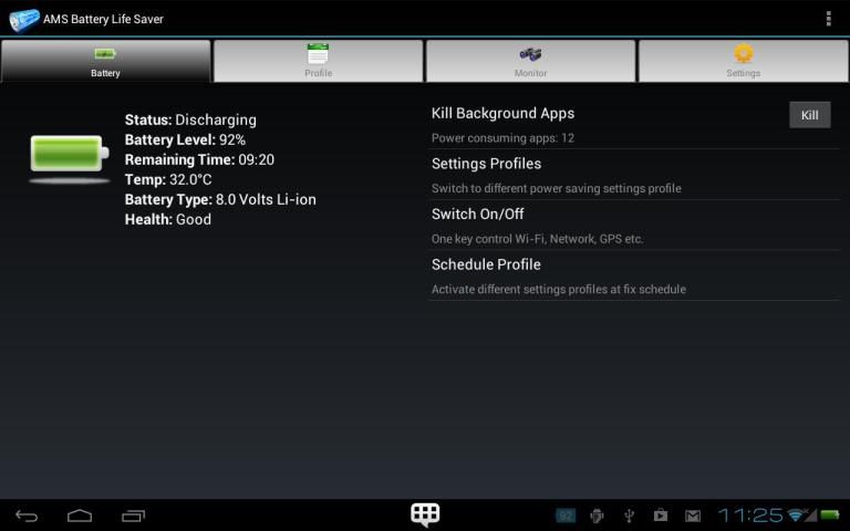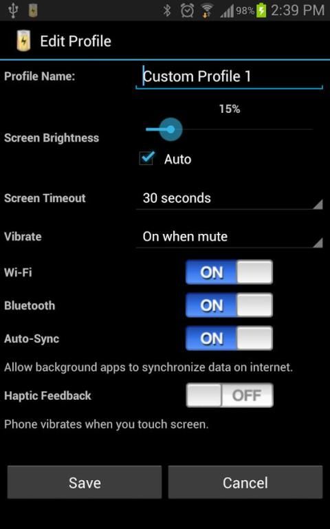 Battery Life Saver comes with built-in battery saving profiles. You can also create your own battery saving profiles. A battery saving profile is a group of settings to switch on/off certain features - all at once.