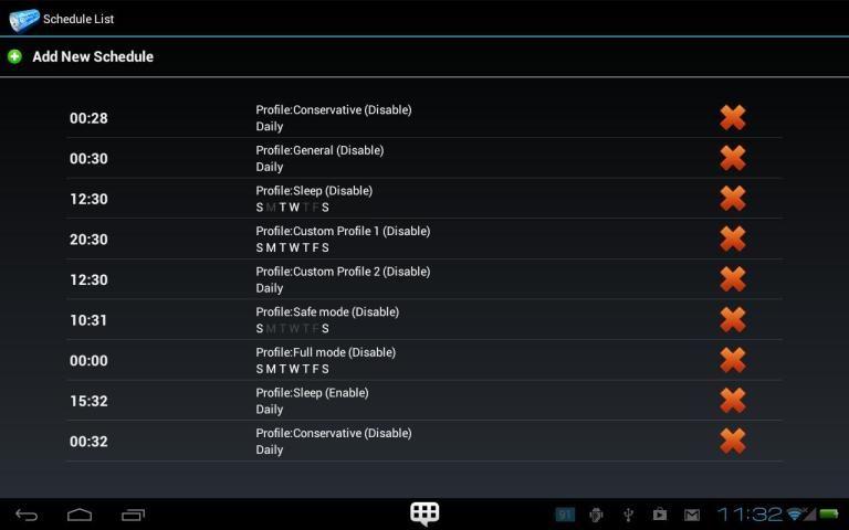 Battery Life Saver allows you to activate certain battery saving profiles at fix schedule. For example you can schedule a battery saving profile to be activated when you go to sleep at night.