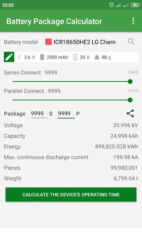 The application allows you to calculate battery packs up to 9999S 9999P - almost 100 millions batteries :) What will allow you to calculate packages for electric bikes and such large packages as for electric cars (EV).