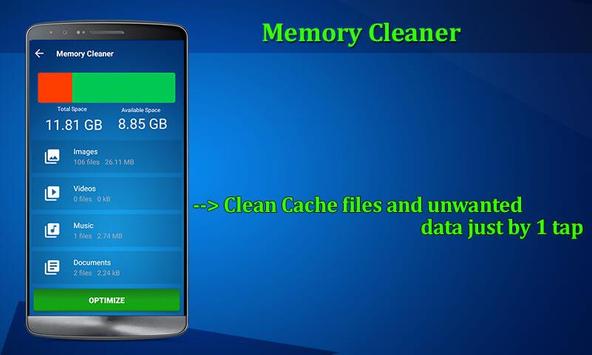 Displays available space for images, audio, video ect and Optimize to clean cache and empty folders.