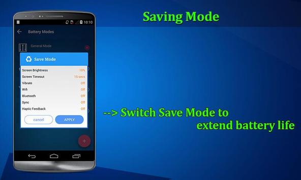 when you switch to saving mode, app automatically adjust brightness, screen timeout etc.