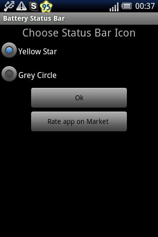 battery Status Bar shows battery charge level indicator as an icon in the status bar. With Battery Status Bar you will always know your exact battery level just with one glance at your status bar.In the notification area apart from battery level percentage it is possible to see battery status chargingdischarging and battery temperature Now two styles of status bar icon are available: Grey Circle and Yellow star And with all this Battery Status Bar application is increadibly lightweightWe are constantly working on improving Battery Status Bar. In the nearest future we will add more styles for icon and more functions. Hope you like it tags Battery percentage, status bar, Battery Indicator, Battery use, android battery percentage, android battery status, android status bar This is only the first version of app. PLEASE send all your wishes suggestions to nastysage@gmail comAnd if you like it please rate it 5 stars :