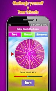 to use this app called Battle Royale random spin for challenges fortnite or PUBG you should select your challenge level ther's three levels (Easy, Normal, Advanced), and then click turn the wheel to find your challenge, try to respect it and be the best player