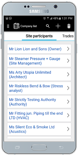 A deficiency can directly be assigned to a responsible company when the photo is added, and a removal date can be added too. In the version for computers (Windows / Mac) you can then print out a list of deficiencies, either as a complete list or by company. This has the advantage of being able to send each company its own list of deficiencies.