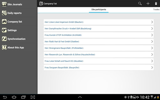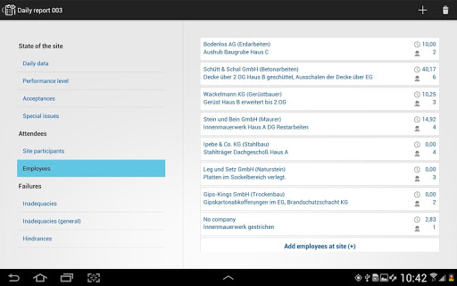 This program lets you enter daily progress reports right during your site inspection. It uses the company list of your project so that the actual writing effort is significantly reduced. With the dictation function and later transcribing on the Site-Journal desktop version, time is saved and the typing on small devices is reduced.
