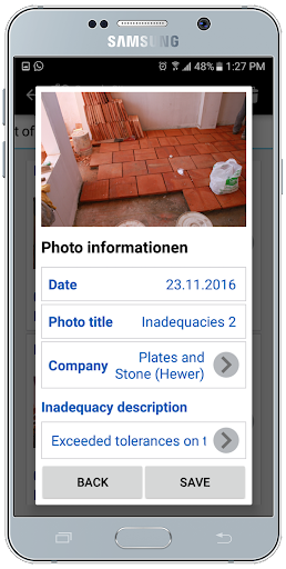 Management of deficiencies: The documentation of deficiencies is an unpopular but essential task of the construction manager. The app allows you to take photos in series, and then add a description of the problem to the photo. This description will immediately form part of the list of deficiencies, into which also defects without photo can be taken.