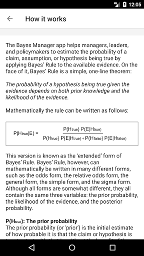 The Bayes Manager app helps managers, leaders, and policymakers to estimate the probability of a claim, assumption, or hypothesis being true by applying Bayes’ Rule to the available evidence.