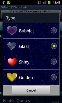You can change the Hearts Type that wander around your screen: Bubbles and Shiny Types are available for the free-Lite version; Diamonds, Solid and Broken are added to the Full Version.
