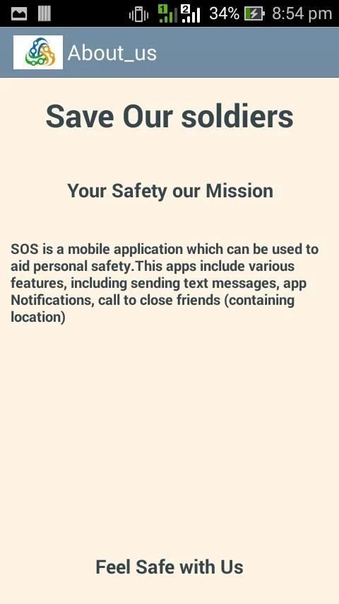 SOS is a mobile application which can be used to aid personal safety.This apps include various features, including sending text messages, app Notifications, call to close friends (containing location).