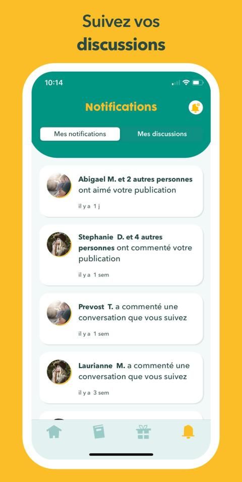 Choisissez parmi 30 thèmes de discussion, et rencontrez et échangez avec d'autres parents, dans une atmosphère bienveillante. Que vous soyez futur ou jeune parent, maman ou papa, notre communauté vous accueillera à bras ouverts - et vous pourrez y poser vos questions et partager votre expérience en toute confiance, à tout moment.