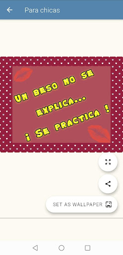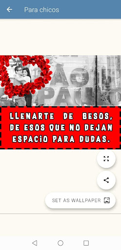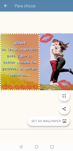 Nuestra App "Frases de besos para mi Amor" es fácil y sencilla de utilizar, desplázate por nuestra galería de imágenes la cual tiene una resolución FULL HD y elige la que más te agrade y empieza a compartirlas por tus redes sociales o salas de chat favoritos o si deseas puedes descargarla y personalizarla con el mensaje ideal para tu pareja o utilizarla como: fondo de pantalla, foto de perfil, pantalla de inicio, foto de contacto, pantalla de bloqueo, etc.
