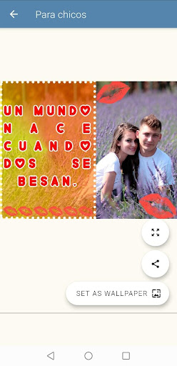 Nuestra App "Frases de Besos para mi Amor" consta de una hermosa galería de imágenes fotográficas muy románticas, son fondos cuidadosamente seleccionados para ti, para lograr el efecto deseado... enamorar, está dividida en dos actividades: