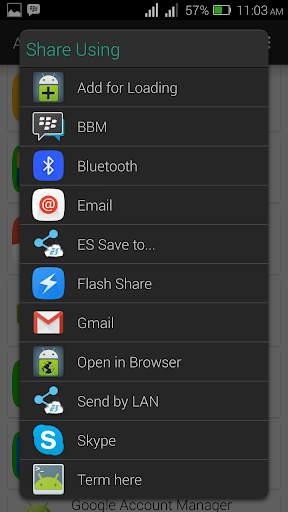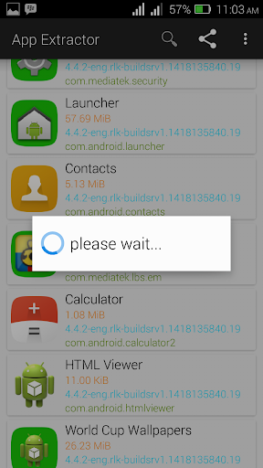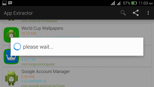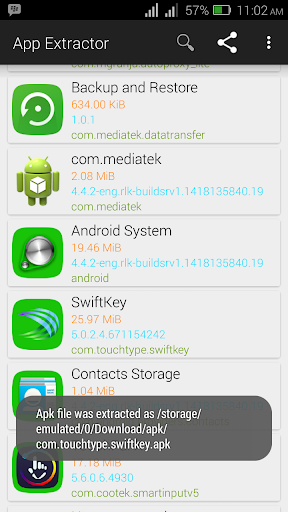 Apk Extractor creates lists of all installed apps and system apps and allows search to filter lists. Clicking on any apps name extracts it to a defined folder on your memory card as a .apk file. Longclicking on an app name allows sharing to through several media, including email, bluetooth, wifi, whatsapp, facebook, messenger, file managers, bbm, twitter, flash share, etc.