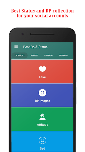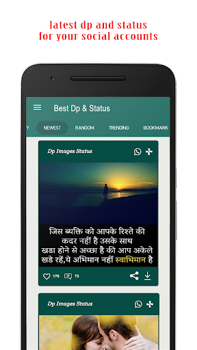DP & Status simple user interface Latest & Trending Status many categories....! DP and Status is the best way to express your feelings. You can download and Save them into your phone and Set as Display Pictures.